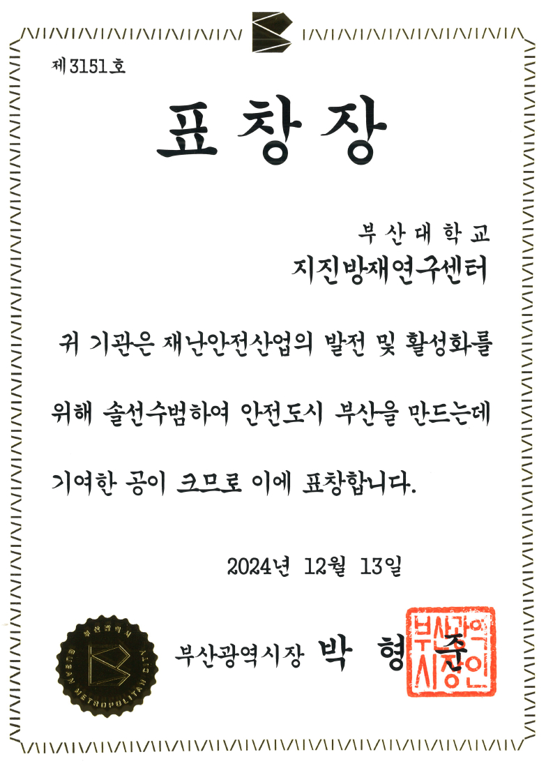 [2024.12.13.] 부산시 표창 수상(지진방재연구센터)