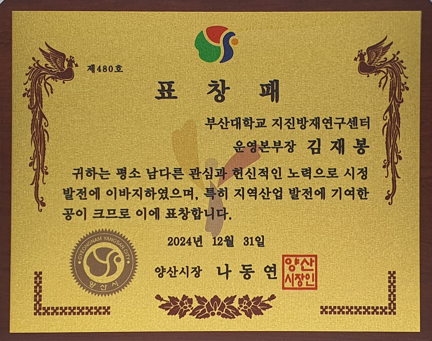김재봉 연구교수가 2024.12.31. 시정발전 및 지역산업 발전에 기여한 공을 인정받아 양산시 표창을 수여 받았습니다.